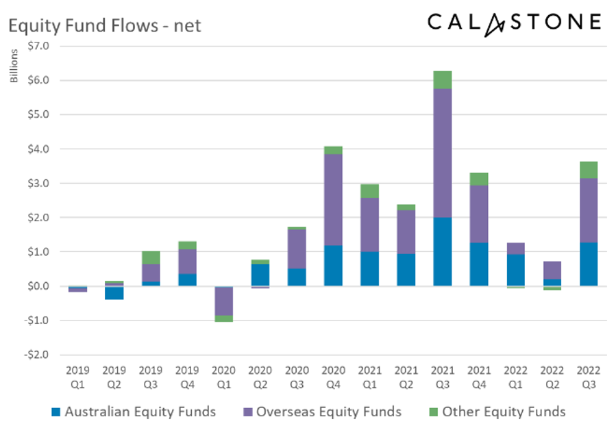 Investor enthusiasm waned as the quarter progressed. Net inflows to all equity funds of A$2.01bn in July slipped to A$1.28 in August. Then, as share prices rolled over towards the end of August, confidence slumped and net investment fell to A$342m in September, 60% below the monthly average for the last year. In the last five days of the quarter, there was a note of capitulation, however: investors sold a net A$122m.