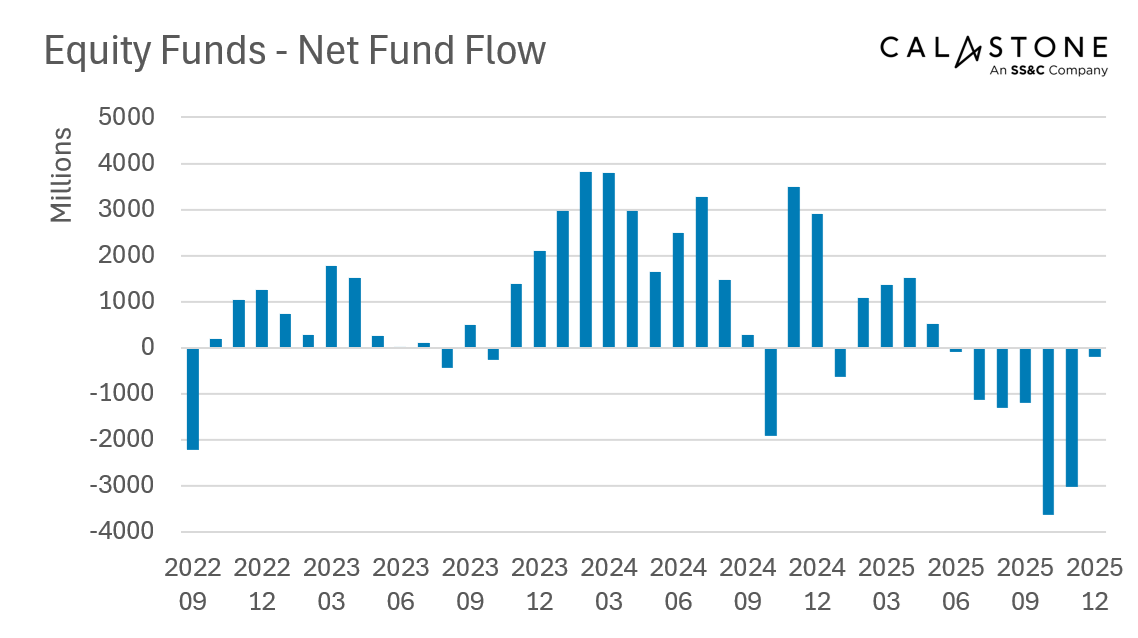 2025 saw the largest ever outflows from equity funds after December delivered an unprecedented seventh consecutive month of net selling, according to the latest Fund Flow Index from Calastone, the largest global funds network.