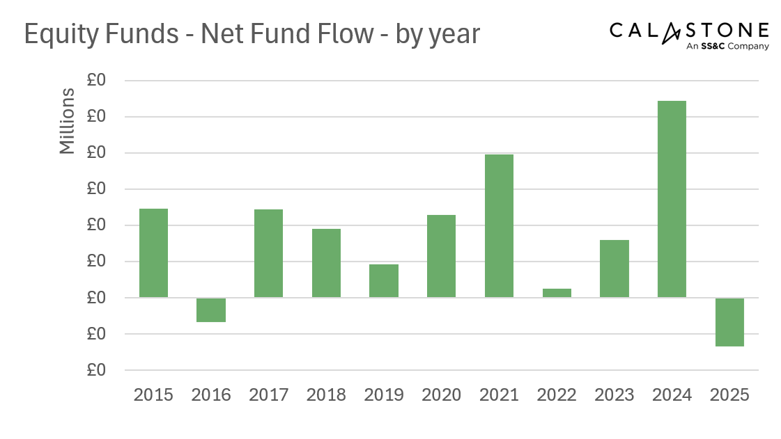 British investors withdrew a net £188m from equity funds in December taking outflows since June 2025 to a net £10.57bn in the largest and most prolonged selling spree on record. 2025 as a whole was down £6.71bn, comfortably the worst year in Calastone’s 11-year data history and more than double the previous record of -£3.34bn set in 2016, the year of the Brexit referendum.