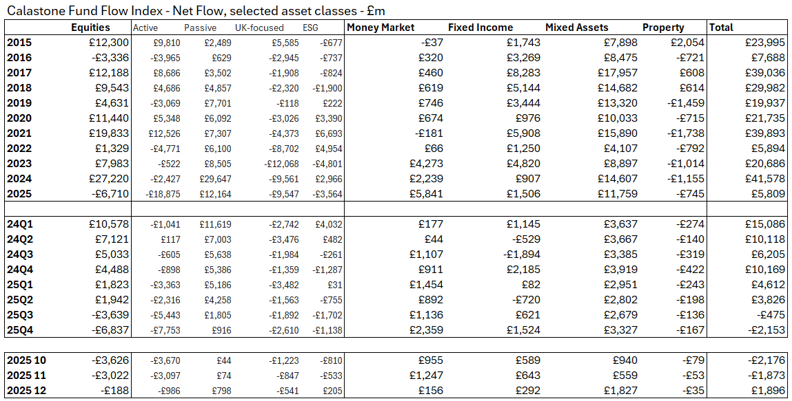 Other asset classes enjoyed a much stronger 2025. Diversified mixed-asset funds came out on top. They attracted a net £11.76bn, down year-on-year, but in line with their 10-year average. Meanwhile, safe-haven money market funds had a record year, absorbing a net £5.84bn of new cash. Fixed income funds saw inflows rise by half to £1.51bn though this was less than half the decade average, reflecting volatile conditions in bond markets. Each of these three asset classes also saw inflows in December.