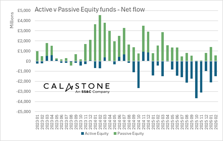 Active equity funds have seen outflows for 14 consecutive months, even as index trackers continue to enjoy inflows. The last time passive funds saw redemptions was August 2023. In February investors sold down £1.50bn of active funds but bought £571m of passive ones.