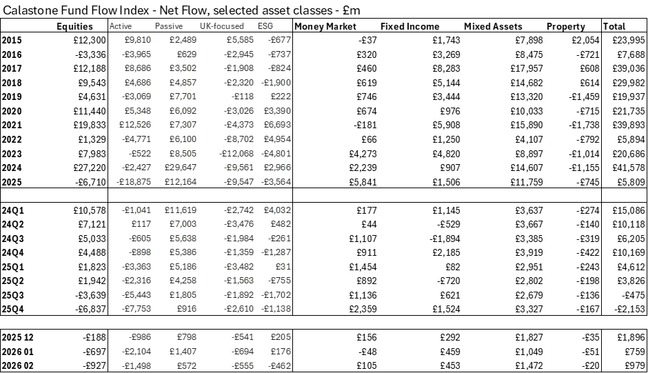 Between June 2025 and February 2026, a net £12.2bn has been pulled from equity funds, enough to reverse more than a typical year’s worth of inflows.