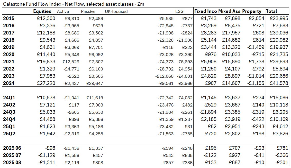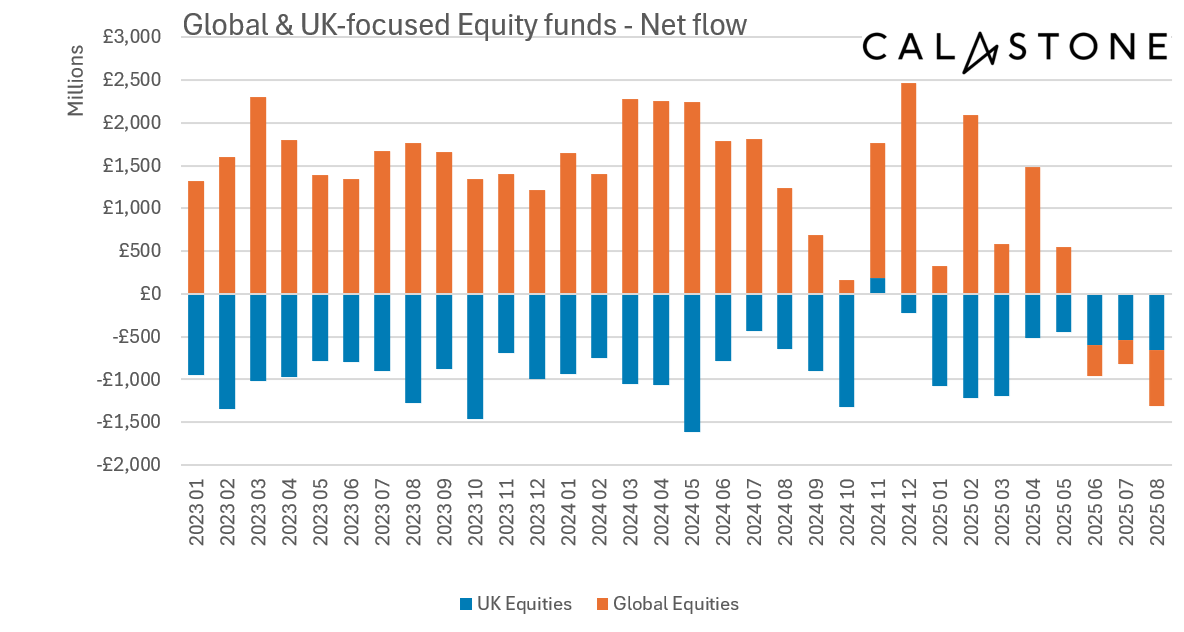 Record stock prices failed to inspire confidence in August as investors accelerated their flight from equities, according to the latest Fund Flow Index from Calastone, the largest global funds network. Investors withdrew £1.31bn from equity funds, up from net selling of £1.13bn in July, marking the worst bout of outflows since the summer of 2022. Meanwhile, safe-haven money market funds enjoyed their best month in two years. Investors added a net £633m to their holdings.