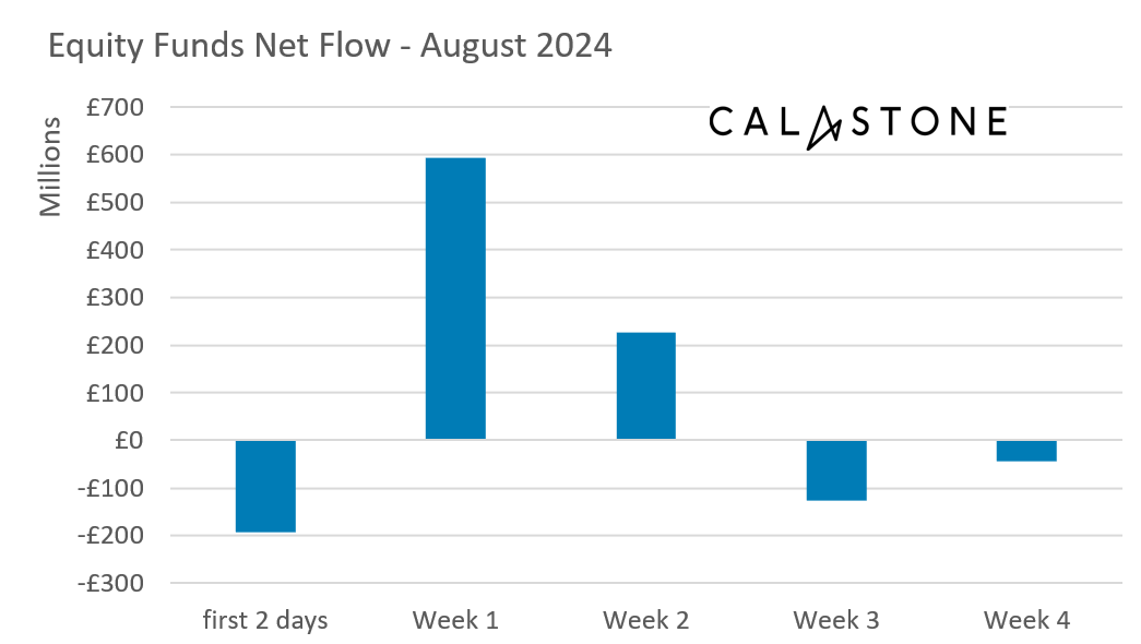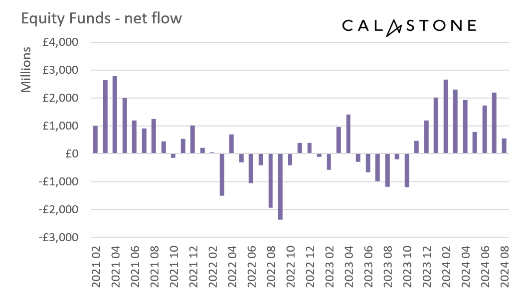 Inflows to equity funds fell sharply in August, according to the latest Fund Flow Index from Calastone, the largest global funds network. The short-lived market panic at the beginning of the month that saw stock markets worldwide fall sharply before rebounding knocked confidence and meant equity-fund inflows fell to £545m, down by three quarters (75.1%) month-on-month and to their lowest level since November 2023[1]. But it is important to note that there were still inflows.