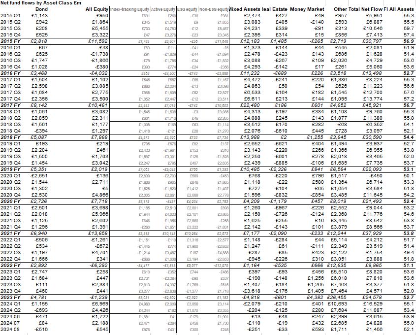 UK-focused equity funds saw outflows once again on the rise in August after July had seen their least-bad month in three years. Net selling of -£510m was more than double the July total, but this was still well below the -£660m monthly average since outflows began in earnest in September 2021.