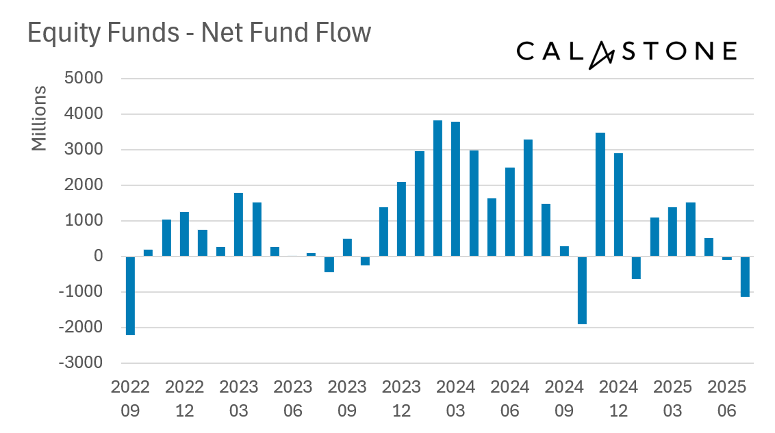 UK investors withdrew capital from equity funds at pace in July, according to the latest Fund Flow Index from Calastone, the largest global funds network. Equity funds suffered net outflows of £1.13bn in July, up from outflows of £98m in June. July’s outflows were the largest from equity funds since the infamous Truss Mini-Budget in September 2022 with the exception of October 2024 when there was a bout of profit crystallisation followed by immediate reinvestment ahead of feared Capital Gains Tax (CGT) rises.