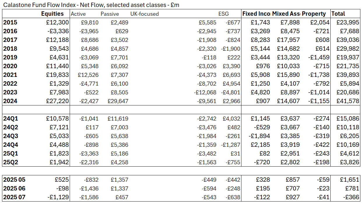 The overall £1.13bn outflow was driven in particular by a sharp drop in buy orders for passive equity funds rather than a big increase in selling; net selling of active equity funds did increase, rising £150m higher month-on-month to £1.59bn, but the most of increased outflows month-on-month was due to a buyer’s strike on passive funds.